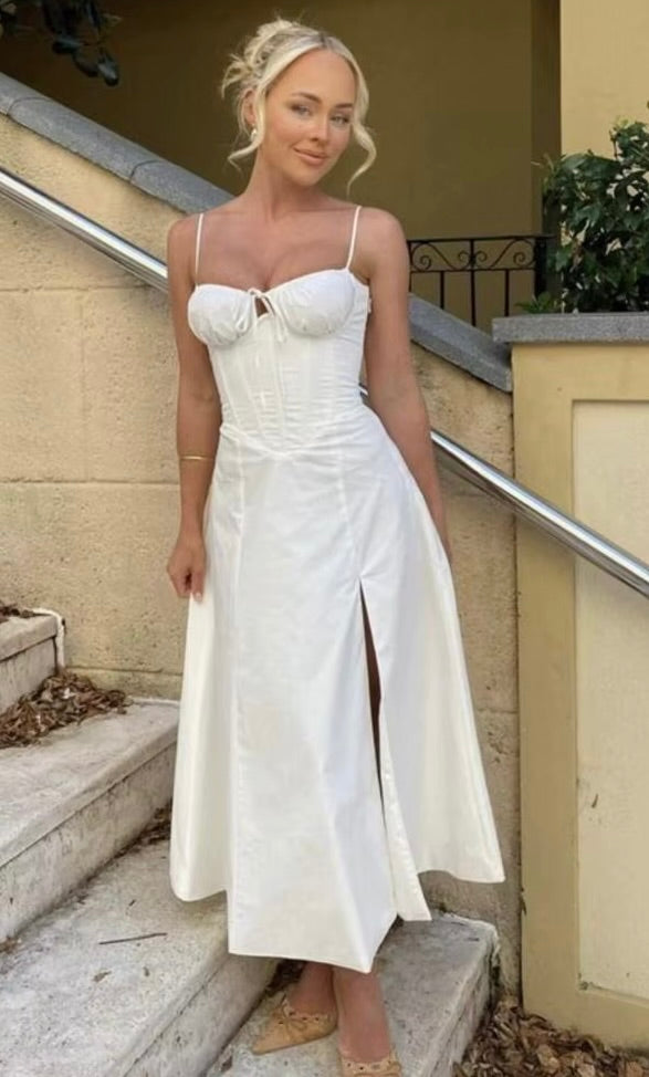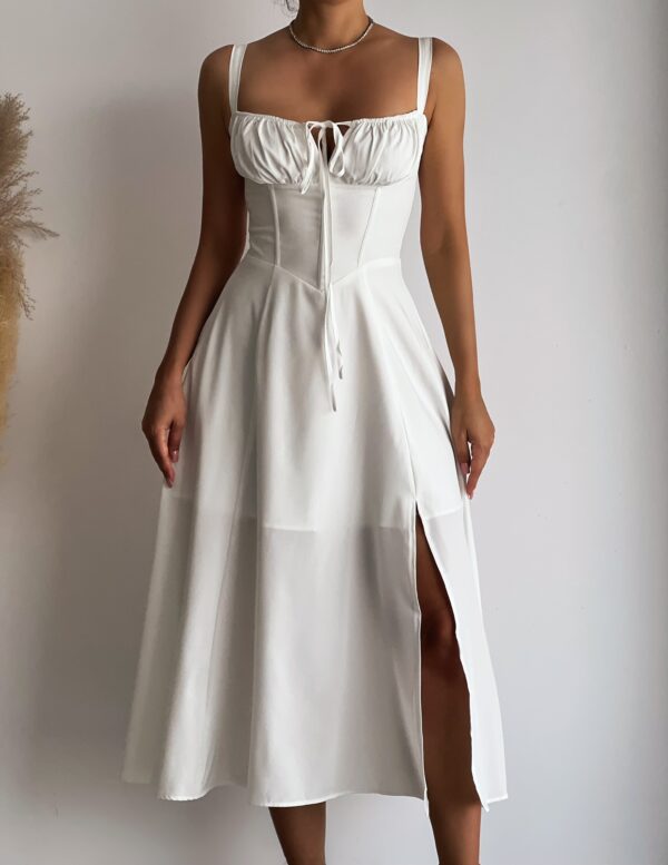 This dress is exactly what I was looking for! The fabric is smooth and feels very luxurious, perfect for a summer wedding or a fancy dinner. The fit is ideal, it is comfortable and follows the lines of your body nicely. The length is also perfect for my height. The dress is not see-through, which is often a problem with white clothing. I am totally happy with it!